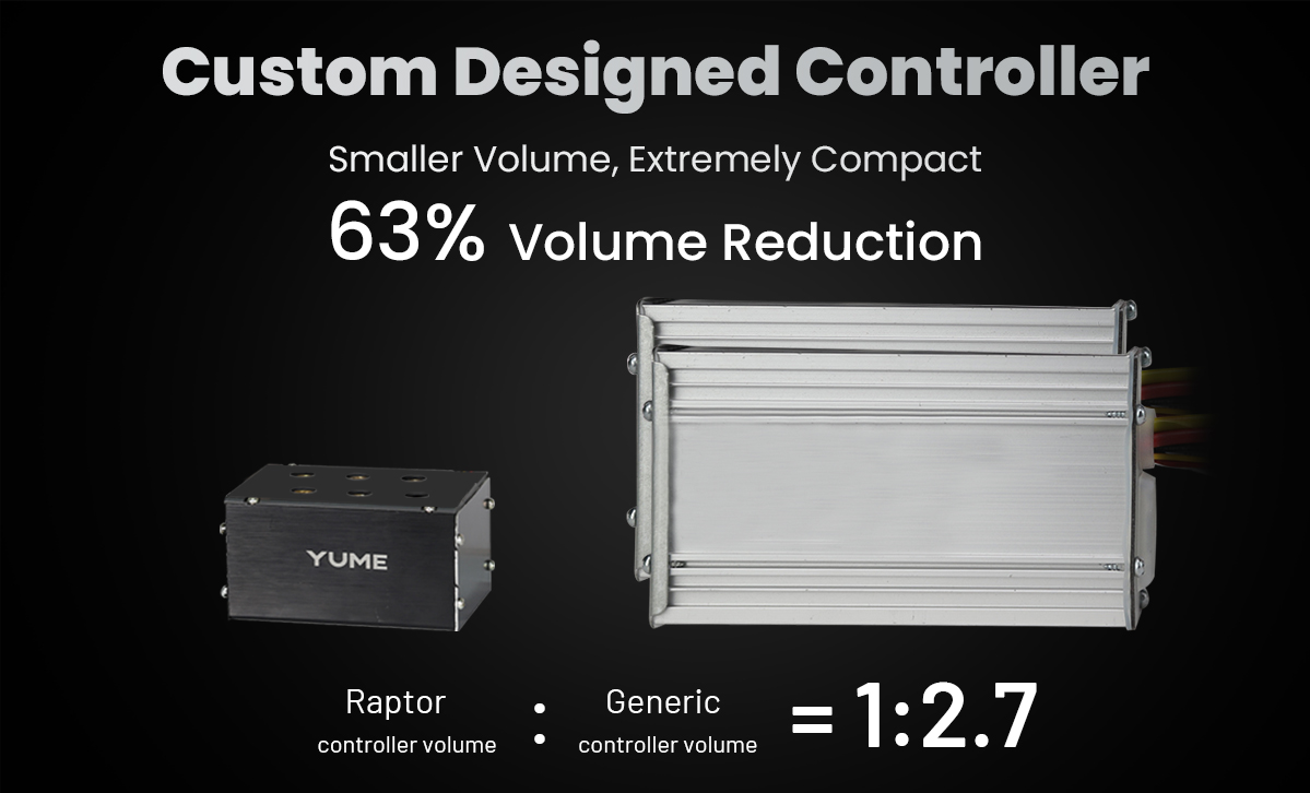 Duální motory s maximálním výkonem 6000 W jsou poháněny speciálně upraveným regulátorem Super 6 MOSFET se sinusovým signálem pracujícím na 60 V. Regulátor je extrémně kompaktní a byl vyladěn tak, aby poskytoval co nejlepší výkon bez kompromisů v dojezdu. Raptor nabízí velkorysý točivý moment potřebný k pohonu motorů, které pojmou velké 11palcové pneumatiky.